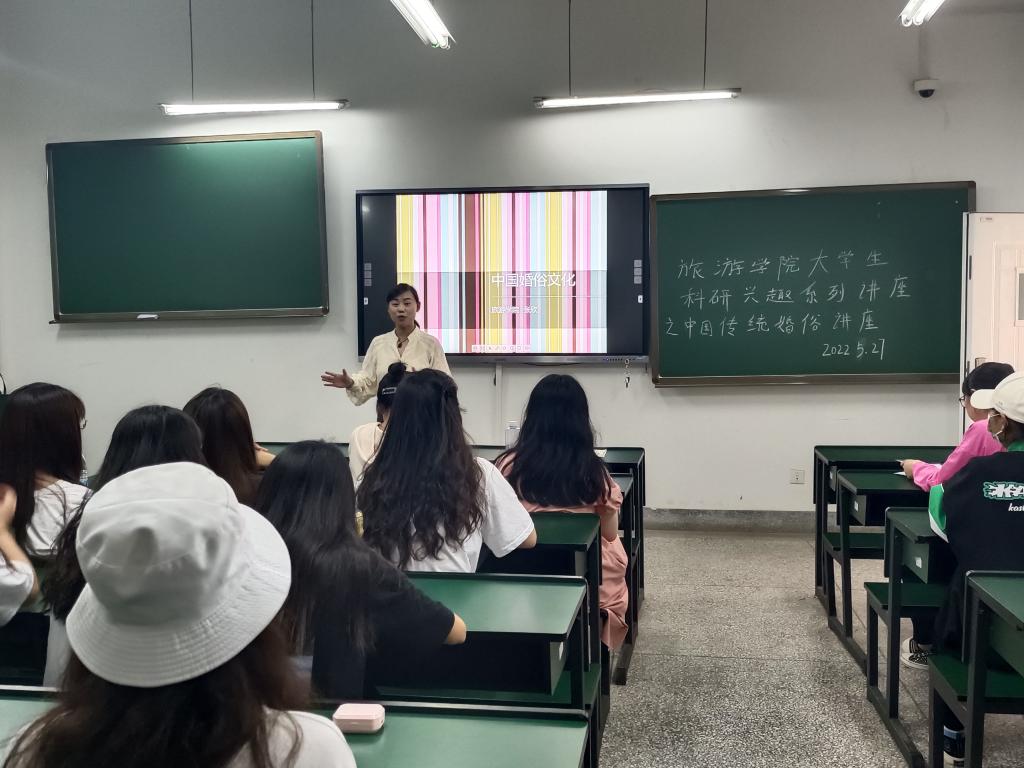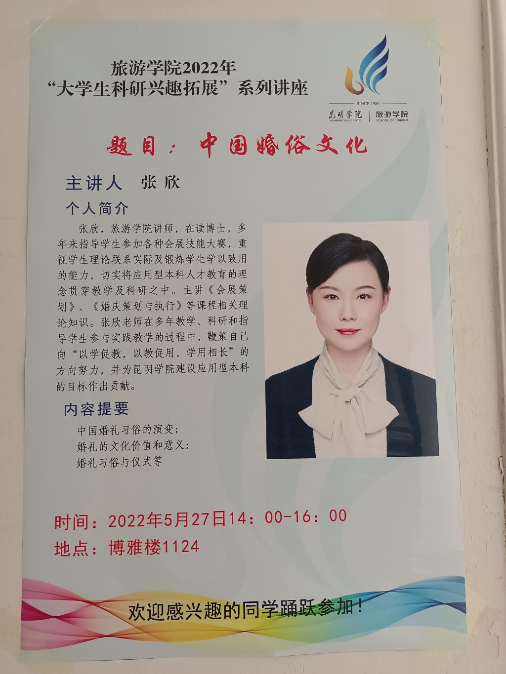 2022年5月27日下午14:00-16:00,太阳成集团tyc122cc在博雅楼1124教室,举办老员工科研兴趣拓展系列第三讲——中国传统婚俗文化,讲座由太阳成集团tyc122cc张欣老师主讲。