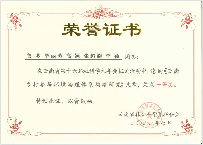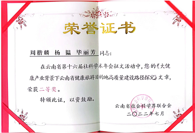 太阳成集团tyc122cc两名博士带领的研究团队在此次年会中获得了优秀论文一等奖和二等奖,他们分别是鲁芬博士乡村旅居研究团队的论文《云南乡村旅居环境治理体系构建研究》、周楷麟博士健康旅游研究团队的论文《大健康产业背景下云南省健康旅游目的地高质量建设路径探究》。鲁芬博士受邀出席年会现场和领奖仪式。