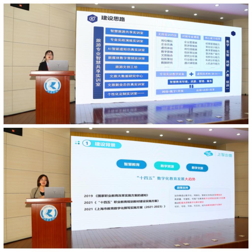 第五环节:企业分享。由全国应用型课程建设联盟旅游专业委员会武克军秘书长主持,来自上智云图教育云平台和西安千策电子信息科技有限公司的代表分享了智慧旅游资源库共创共享,应用型本科旅游专业实训室建设的模式、思路与方向。企业代表希望应用型高校人才培养要以企业、行业和产业的人才需求为导向,打破“产教融合”两张皮现状,打造新的文旅人才培养模式。