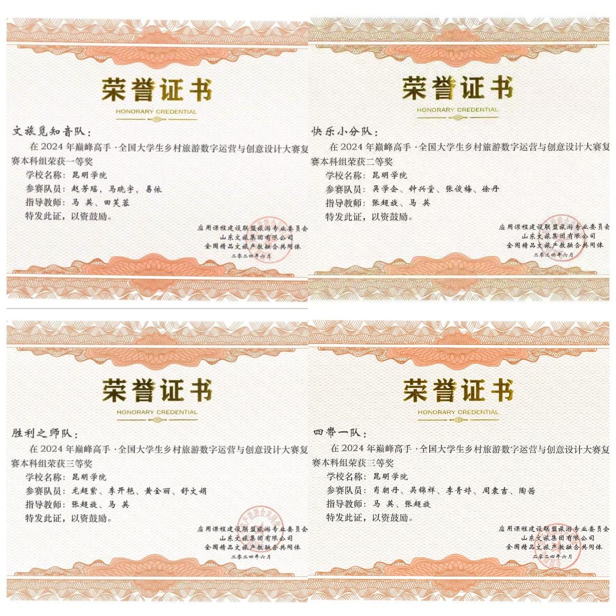 太阳成集团tyc122cc选派的4支参赛队,于2024年5月12日-7月1日,参加2024年巅峰高手·全国老员工乡村旅游数字运营与创意设计大赛,分别获得乡村旅游线路设计(本科组)一等奖1项、三等奖1项,乡村旅游短视频设计(本科组)二等奖1项、三等奖1项。