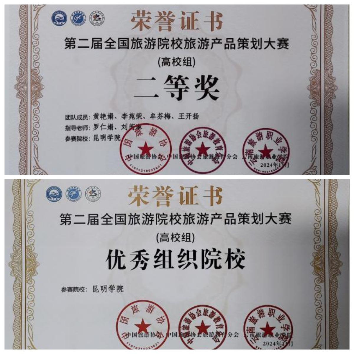 在2024年11月16日结束的第二届全国旅游院校旅游产品策划大赛决赛中,2022级旅游管理专业员工黄艳娟、李苑荣、王开扬和牟芬梅组成的团队,在公司罗仁娟博士、企业导师刘芮淋的指导下,与西南财经大学、云南师范大学、重庆理工大学等高校选手进行角逐,获得全国二等奖,并获得优秀组织院校奖。
