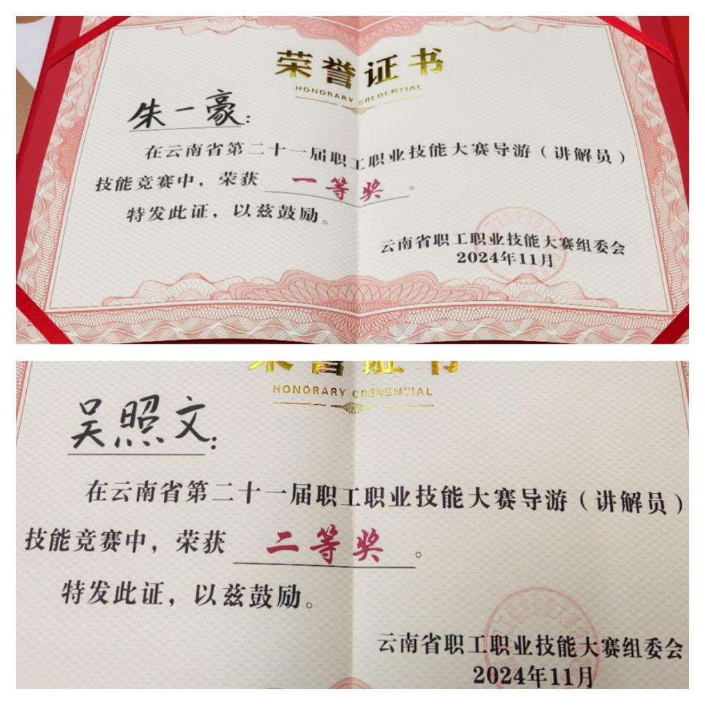 11月29日,云南省第二十一届职工职业技能大赛导游(讲解员)技能竞赛总决赛在保山腾冲圆满落幕。2023级旅游管理专升本班朱一豪同学以总分第一的成绩获得一等奖,同时荣获“云南省技术状元”称号;2023级酒店管理专升本班吴照文同学获得二等奖,同时获得“云南省技术能手”称号。