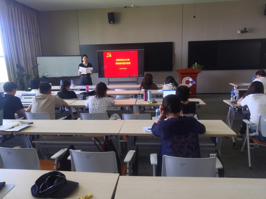 2023年5月5日,按照《122cc太阳成集团官网办公室关于组织开展2023年师德师风警示教育的通知》的工作部署,旅游公司党委结合学习贯彻习近平新时代中国特色社会主义思想主题教育,紧紧围绕深入“学习贯彻落实党的二十大精神和习近平总书记关于师德师风重要论述”的要求,在惟行楼6301教室开展2023年师德师风警示教育,全体教师参会。
