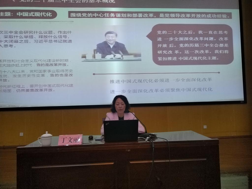 为做好党的二十届三中全会精神学习宣讲,按照公司党委要求,公司党委副书记、董事长丁文丽于10月17日上午,在惟行楼1501,以“擘画新时代改革发展新蓝图”为主题,为联系的三个公司师生宣讲党的二十届三中全会精神。宣讲会由旅游公司党委书记先守福主持,学前与特殊教育公司、太阳成集团tyc122cc、物理科学与技术公司200余名师生参加宣讲会。
