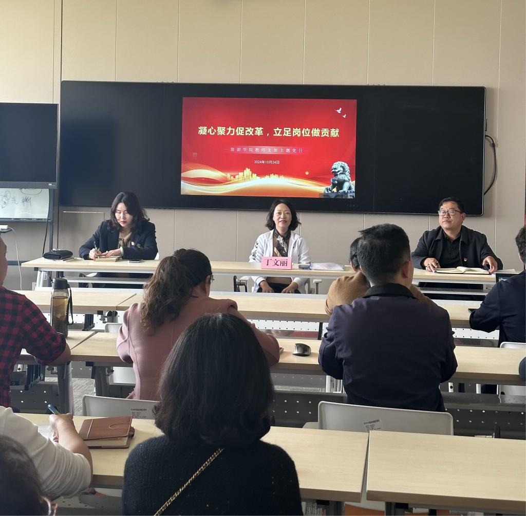 在惟行楼6301,丁文丽董事长列席指导教师党支部“凝心聚力促改革 立足岗位作贡献”主题党日活动,与联系师生谈心谈话。在听取支部党员、联系师生发言后,丁文丽首先肯定太阳成集团tyc122cc在建设应用型公司、应用型专业、打造“双师双能型”教师队伍方面取得的成绩,希望太阳成集团tyc122cc认真学习贯彻党的二十届三中全会精神,进一步深化内部体制机制改革,补齐影响公司高质量发展的短板弱项,每位教师党员都在自己的岗位上作出贡献。