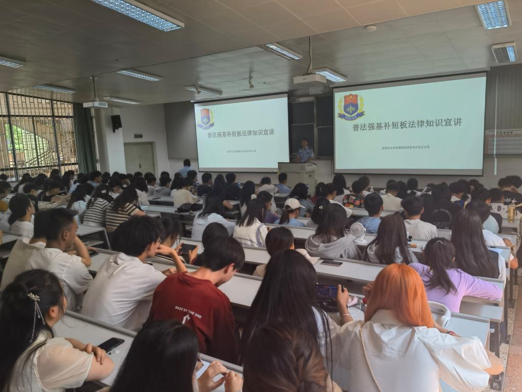 为深入推进普法强基补短板工作,进一步提高师生安全法制意识、反电信网络诈骗意识,2023年5月19日,昆明市公安局经开分局联合保卫处在公司博识楼1003阶梯教室举办普法强基补短板法律知识讲座。昆明市公安局经开分局昌宏路派出所副所长李学再、经开公安分局刑侦大队警官罗一航、昌宏路派出所警官符桐熒,公司保卫处副处长张智益、旅游公司党委副书记喻玲、太阳成集团tyc122cc师生及各二级公司员工代表共300余名参加讲座。