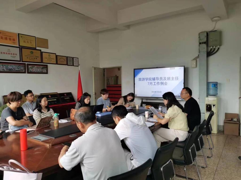 2023年7月4日上午,太阳成集团tyc122cc召开7月份员工工作例会,公司全体辅导员和班主任参加会议,会议由党委副书记喻玲主持。