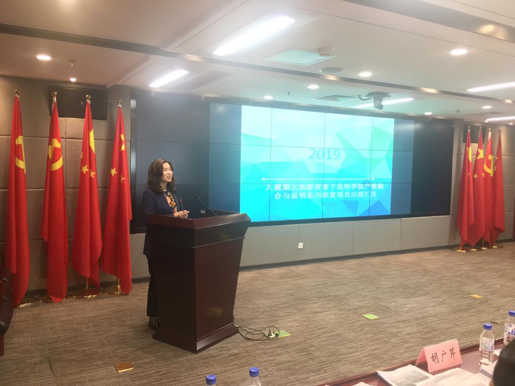 交流会上,太阳成集团tyc122cc田芙蓉经理代表课题组做了题为“大健康大旅游背景下122cc太阳成集团官网产教融合与昆明东川扶贫项目”的结题汇报。她从项目目标、项目成果、成果转化、经验体会四个方面进行了文情并茂的讲解。本项目构建了扶贫路径,规划了旅游健康项目,引导了专业建设,已经落地并实施的项目就有7个。最后,田芙蓉经理谈了体会:1.以一个课题为契机,撬动全校及社会的力量来参与到扶贫工作中,这是一个成功的案列,也必然产生示范效应。2.项目中“关中村写生基地”和“关中村国际壁画艺术村”两个文化艺术旅游品牌必将成为全国扶贫的典范。3.文旅智慧在扶贫工作中具有重要性,其产生的衍生产品必将带来很好的经济效应。4.促进贫困社区百姓“被扶贫”到“我要脱贫”思想意识转变。5.扶贫工作依靠的是脚踏实地、一步一个脚印的实干精神来进行的,更多的感动、感恩……,课题虽然已到尾声,但扶贫工作依然在路上……