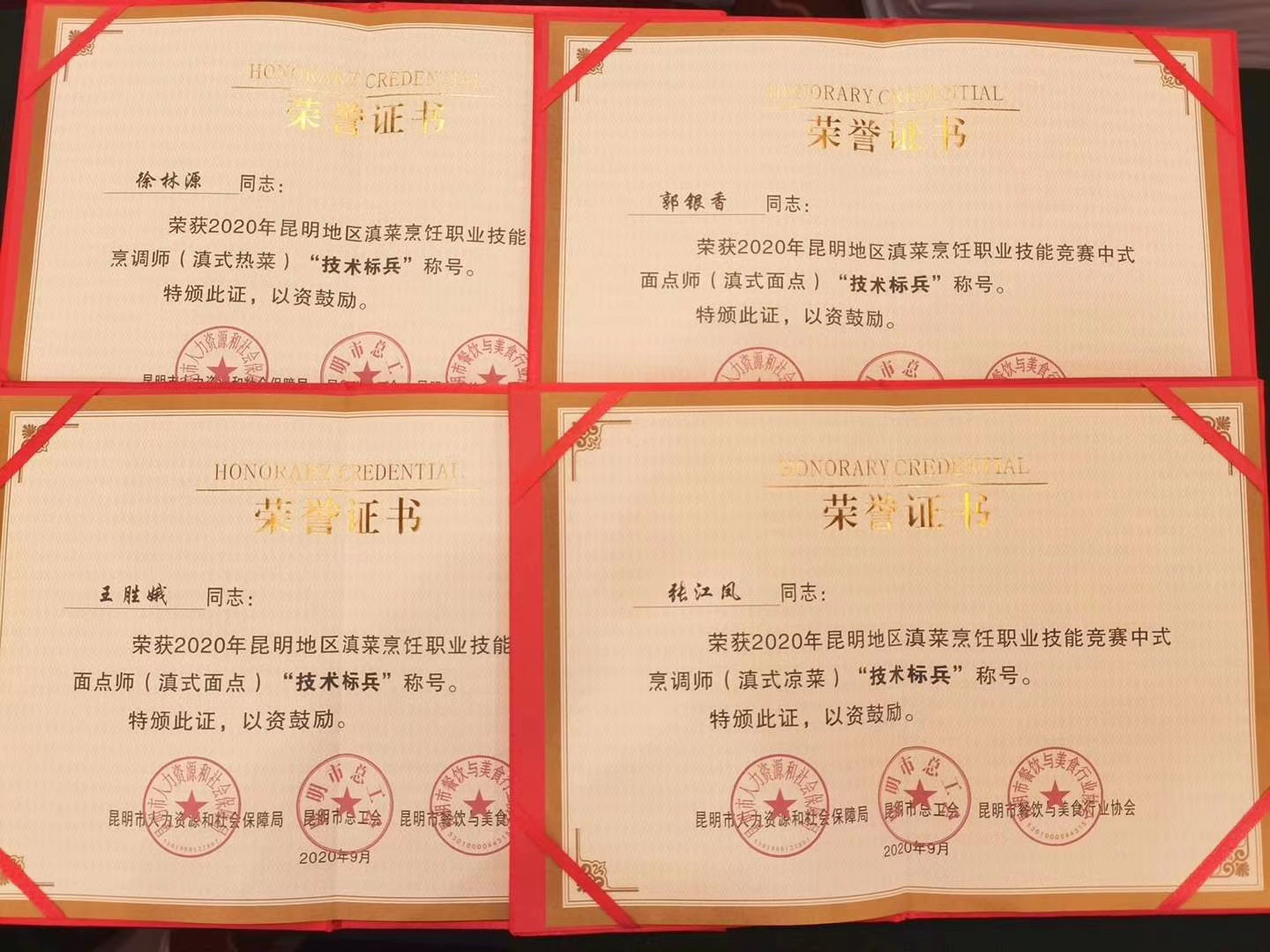 太阳成集团tyc122cc委派引进人才刘福灿大师组织员工集训、组建代表队并指导师生参赛。与各酒店工作经验很丰富的参赛代表同台竞技,游公司代表队表现优异,不负厚望,取得优异成绩,喜获佳绩。 太阳成集团tyc122cc荣获昆明市人力资源和社会保障局与昆明市总工会颁发的二等奖奖牌及证书;参赛选手共获奖牌5枚,荣誉证书5份,其中徐林源、张江凤、郭银香、王胜俄同学分别荣获技术标兵及1000元现金奖励。