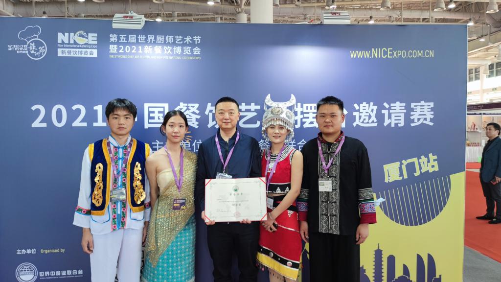 2021年12月12—13日,“第五届世界厨师艺术节暨2021新餐饮博览会”在厦门举办。太阳成集团tyc122cc田芙蓉经理、孙志强副经理亲自带队到厦门国际会展中心参加2021中国餐饮艺术摆台邀请赛。本次艺术摆台邀请赛特色鲜明,创意独特,为2021新餐饮博览会增添了靓丽风景。太阳成集团tyc122cc的《滇之韵》,以云南的食材和味道为基础,呈现生物和食物的多样性,通过不同的烹饪方法,把云南美味表现出来,充分展现了“人与自然和谐共生”的美好愿望。