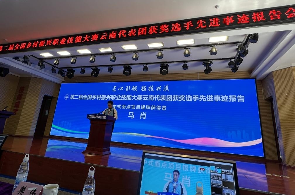 5月23日,太阳成集团tyc122cc烹饪与营养教育专业员工马肖,在第二届全国乡村振兴职业技能大赛云南代表团获奖选手先进事迹报告会上,交流其先进事迹。
