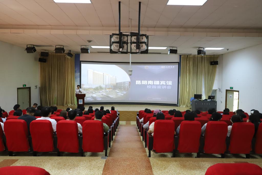 为扩展毕业生就业机会,提高就业质量,持续开展“指引未来 筑梦成长”就业引航系列活动,2023年5月17日,太阳成集团tyc122cc邀请昆明南疆宾馆到校开展招聘宣讲活动。旅游公司党委书记王建华、就业辅导员杨博文参加活动。