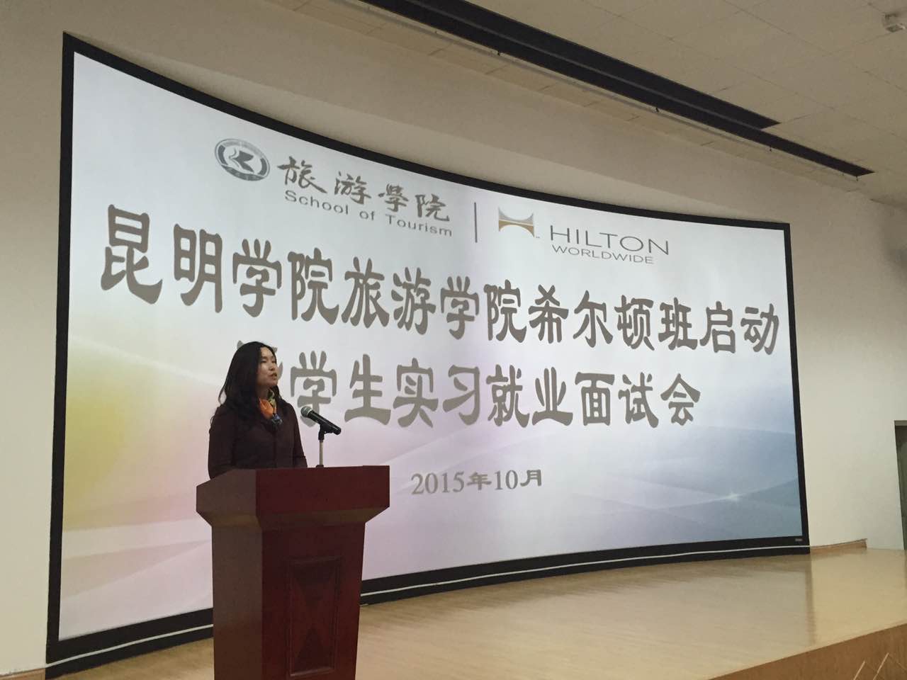 出席本次开班仪式暨就业启动会的有希尔顿酒店管理集团大中华区招聘负责人Will秦及旗下8家酒店:抚仙湖希尔顿酒店、西双版纳万达希尔顿逸林度假酒店、大理实力希尔顿酒店、深圳蛇口希尔顿南海酒店、厦门希尔顿逸林酒店、无锡灵山元一希尔顿逸林酒店、常州新城希尔顿酒店的人力资源部总监或人力资源部经理,太阳成集团tyc122cc经理田芙蓉、副经理吴跃辉、副书记杨光明、酒店管理教研室专业骨干教师,2014级、2015级酒店管理1、2班,2014级烹饪与营养教育1、2、3班260多名同学及教师参加。开班仪式由酒店教研室主任马英老师主持。